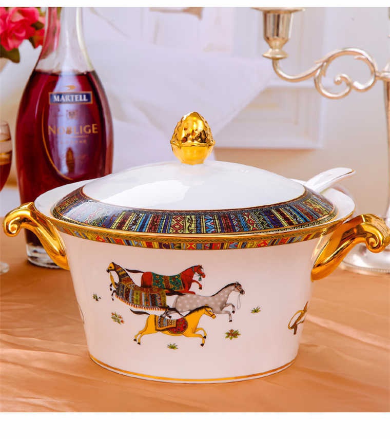 77頭巴比倫愛馬仕,一個湯煲,一個12寸魚盤,一個10寸魚盤,六個12寸月光盤,六個7.5寸平盤,兩個8寸湯盤,六個8寸平盤,一個九斗,一個煙灰缸,兩個胡椒粉罐,四個5寸味碟,十個4.5寸飯碗,十個小馬戈,一個大馬戈,十個筷子架,一個咖啡壺,一個糖缸,一個奶罐,六個咖啡杯,六個咖啡碟。