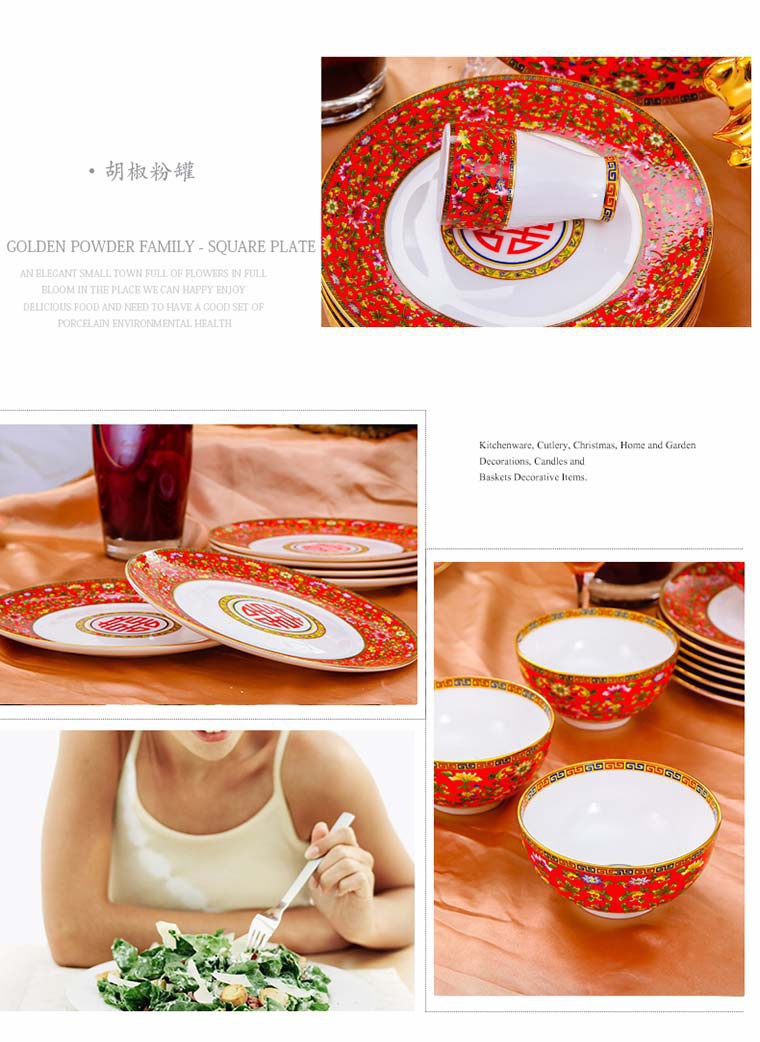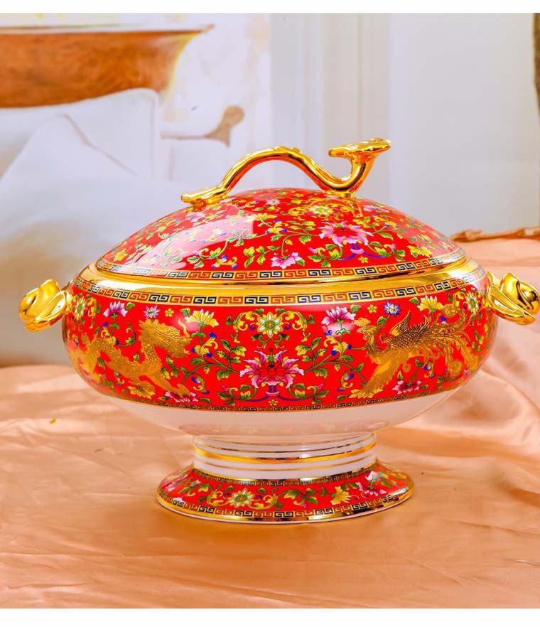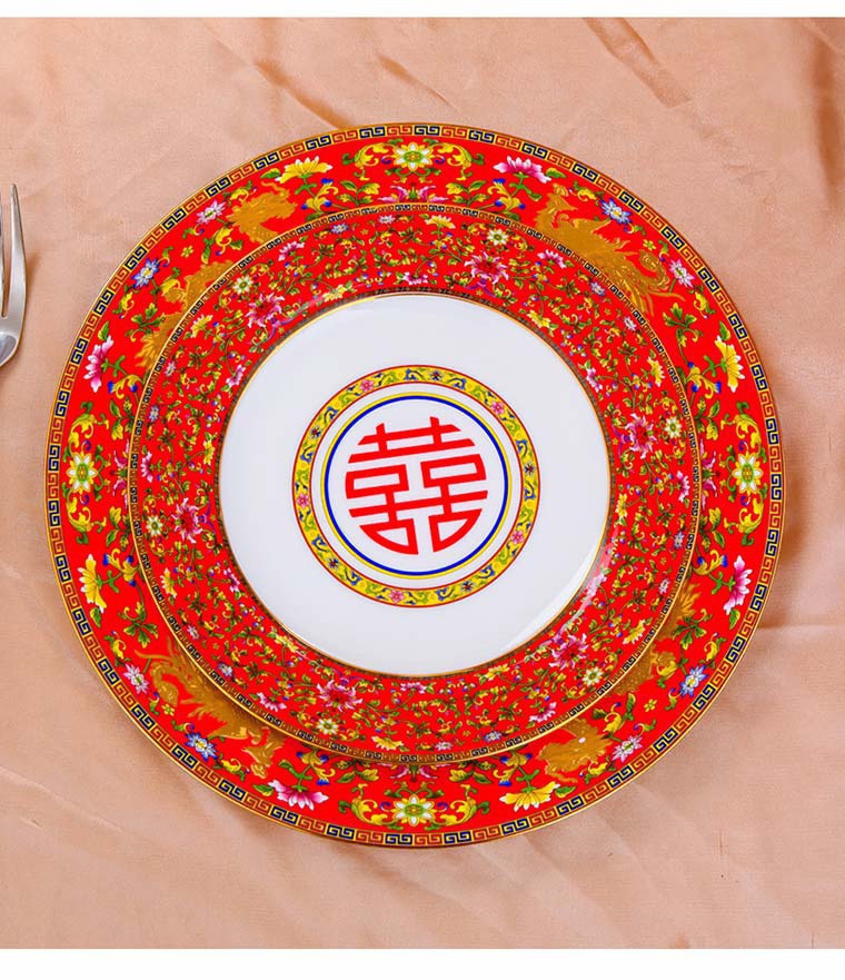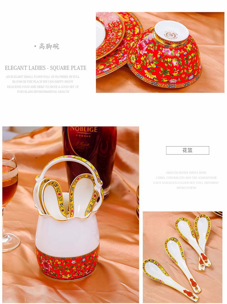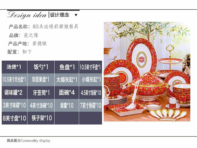 85頭琺瑯彩新娘餐具,一個(gè)湯煲,一個(gè)飯勺,一個(gè)魚盤,一個(gè)10.5寸平盤,一個(gè)10.5寸月光盤,雙層果盤一個(gè),一個(gè)大煙缸,一個(gè)小煙缸,二個(gè)調(diào)料罐,一個(gè)牙簽筒,四個(gè)面碗,十個(gè)4.5寸飯碗,十個(gè)三寸調(diào)味碟,十個(gè)4寸湯碗,十個(gè)調(diào)羹,十個(gè)7寸骨碟,十個(gè)8寸盤,十個(gè)筷子架。