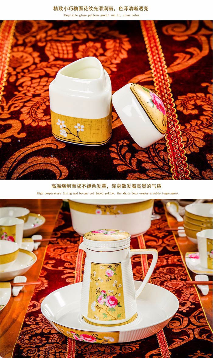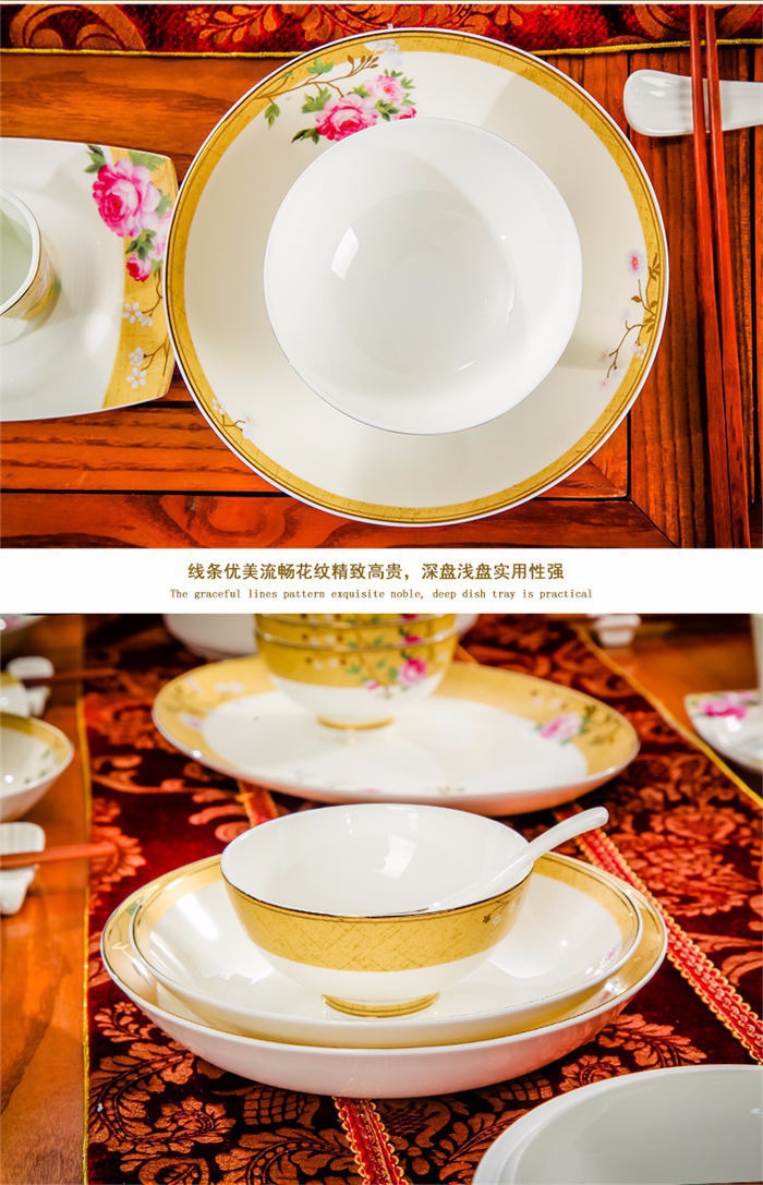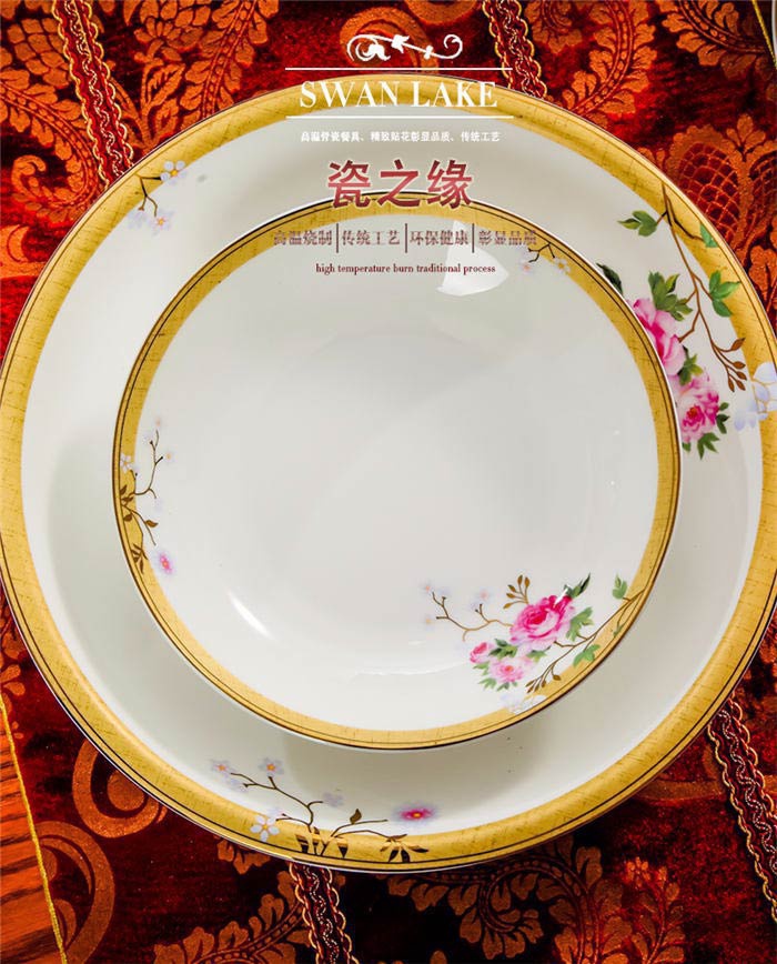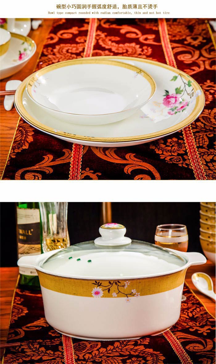 72頭花木蘭餐具,餐具60頭 ,一個湯煲,一個魚盤,一個十寸圓盤,一個牙簽筒,一個花籃,一個大飯勺,兩個調(diào)料壺,兩個蓋碗,四個碗,十個4.5寸飯碗,十個4寸湯碗,十個8寸盤,十個調(diào)羹,十個筷子架,