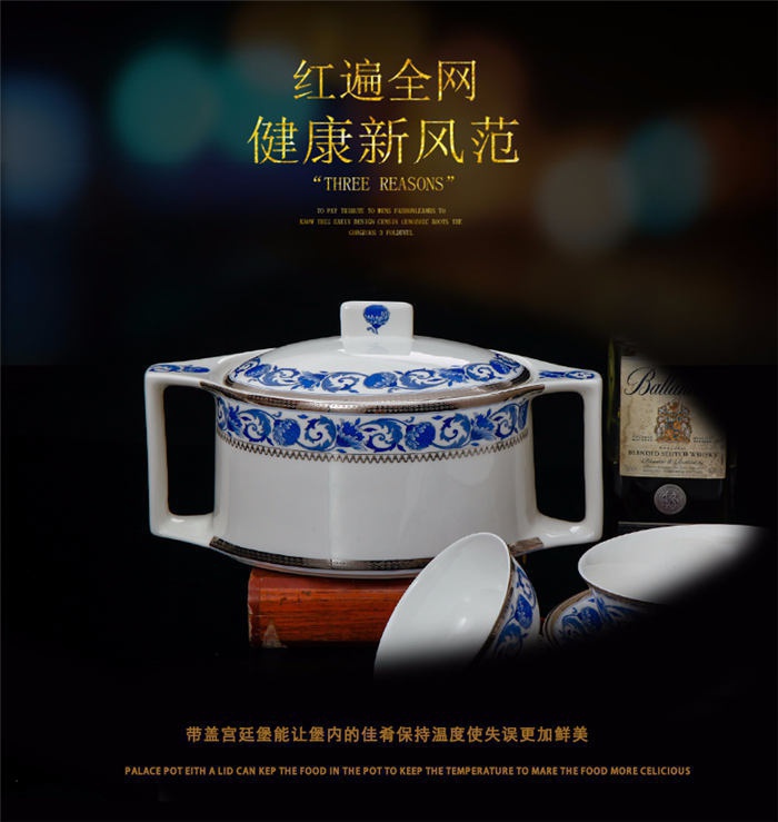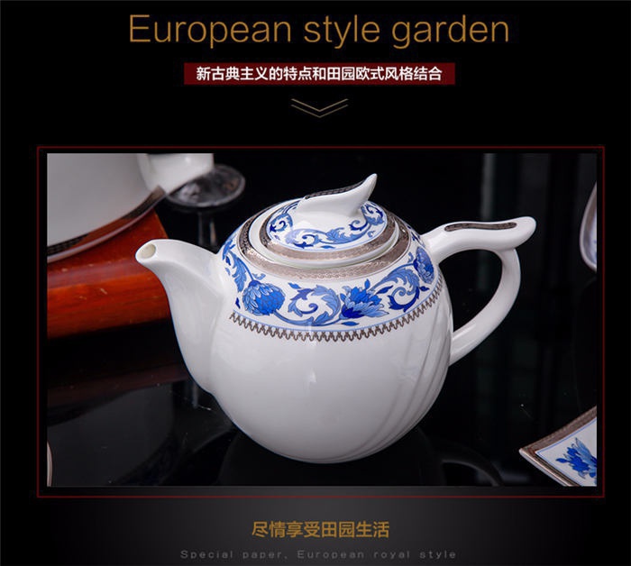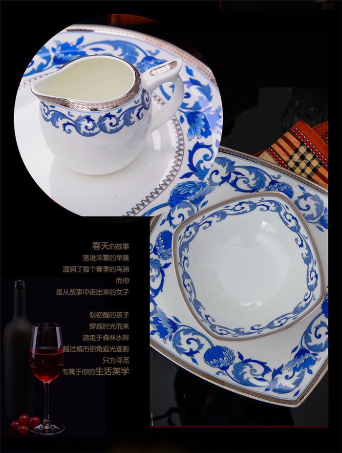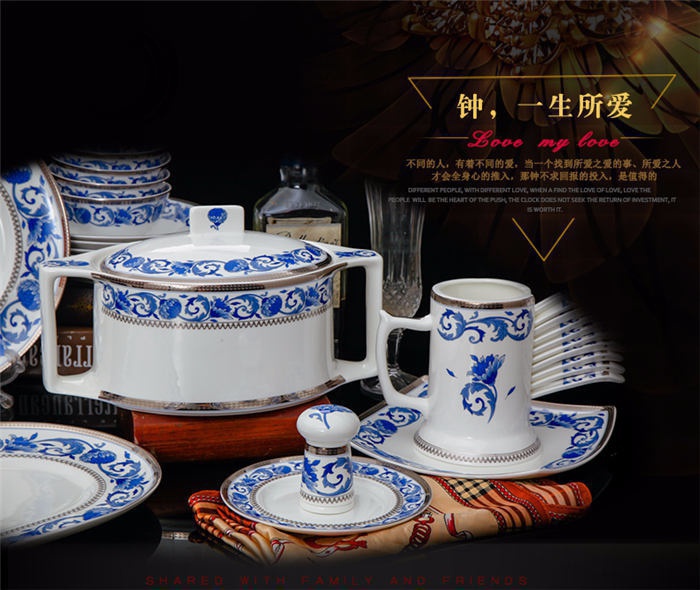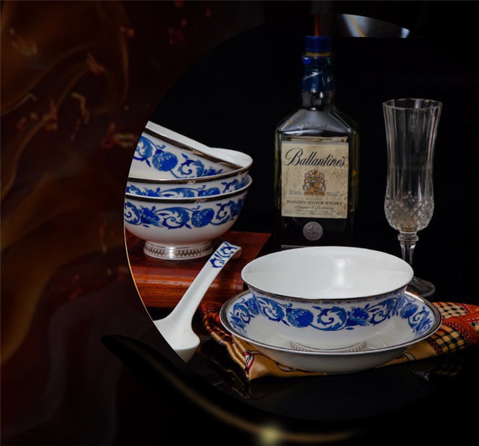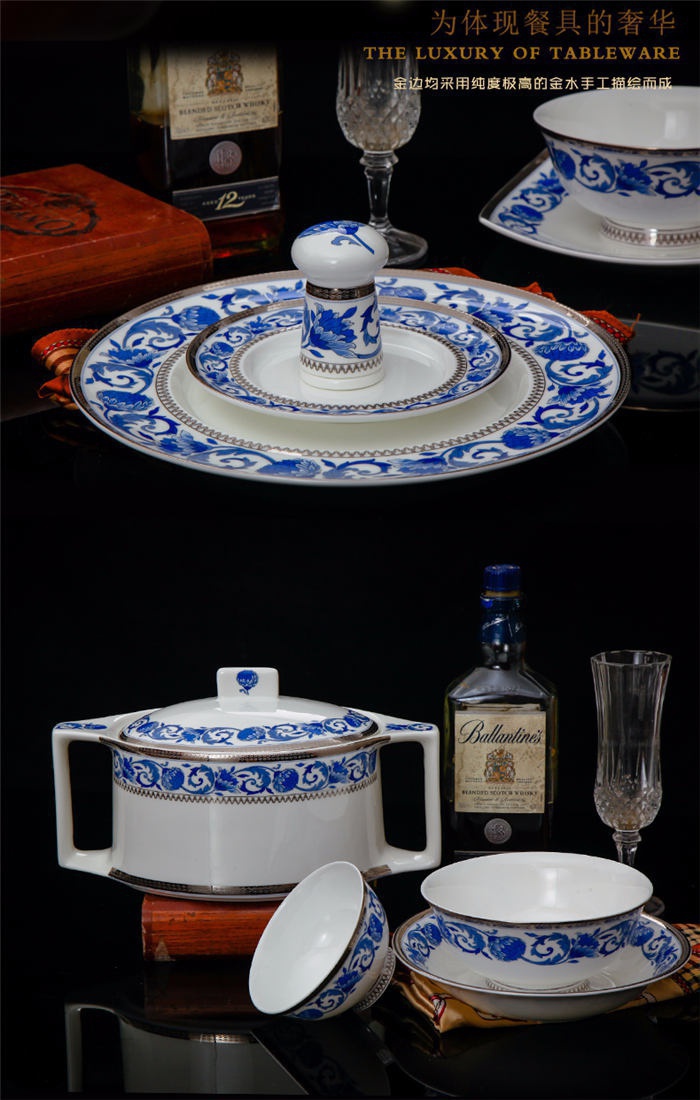 60頭德蘭城堡,一個湯煲,一個魚盤,一個十四寸圓盤,一個湯勺,一個牙簽筒,一個筷子筒,四個面碗,兩個沙拉碟,十個4.5寸飯碗,十個味碟,十個調(diào)羹,四個八寸圓盤,四個八寸方盤,十個筷子架。