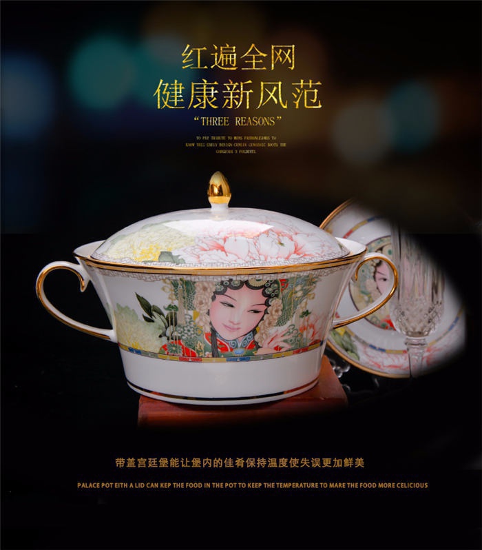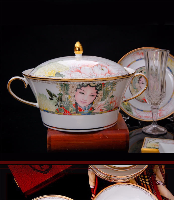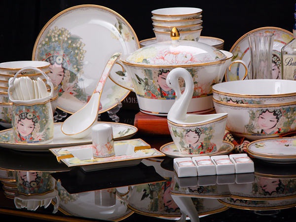 60頭臉譜,一個(gè)湯煲,一個(gè)飯勺,一個(gè)魚盤,一個(gè)十寸平盤,一個(gè)牙簽筒,一個(gè)煙灰缸,兩個(gè)面碗,兩個(gè)大湯碗,一個(gè)花籃,一個(gè)鳥,八塊八寸盤,十個(gè)4.5寸飯碗,十個(gè)骨碟,十個(gè)調(diào)羹,十個(gè)筷子架。