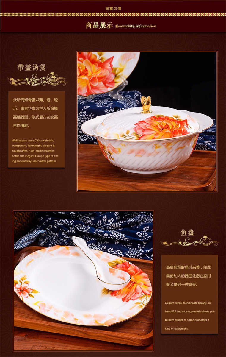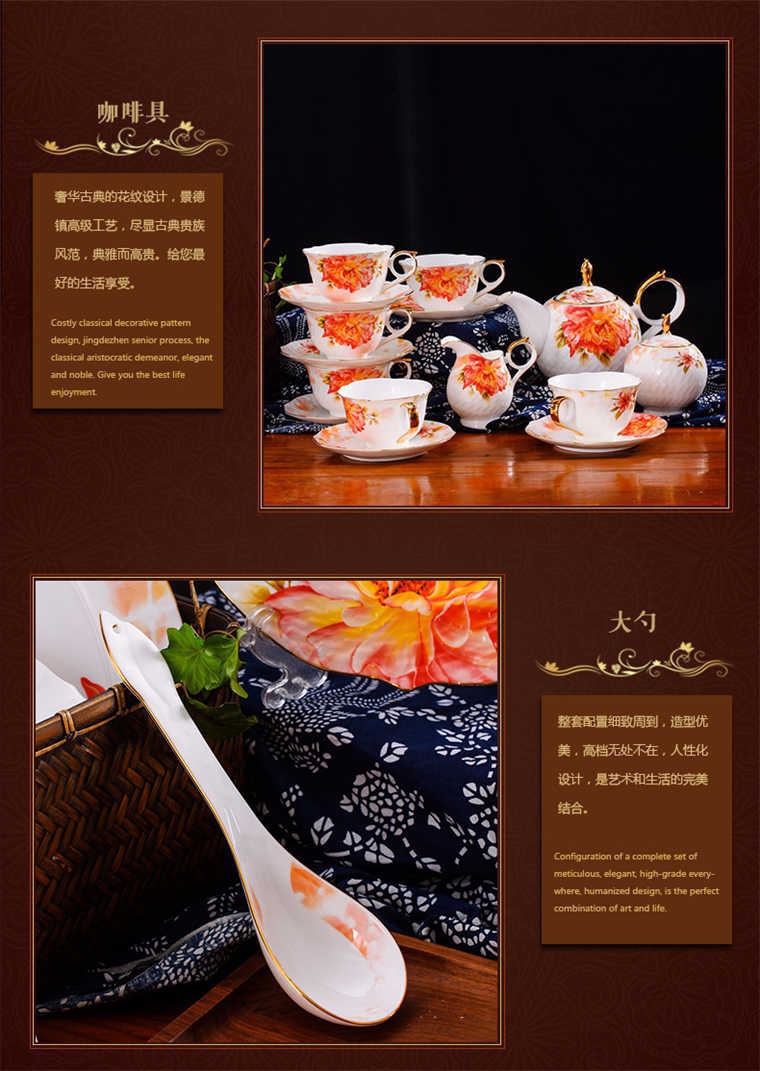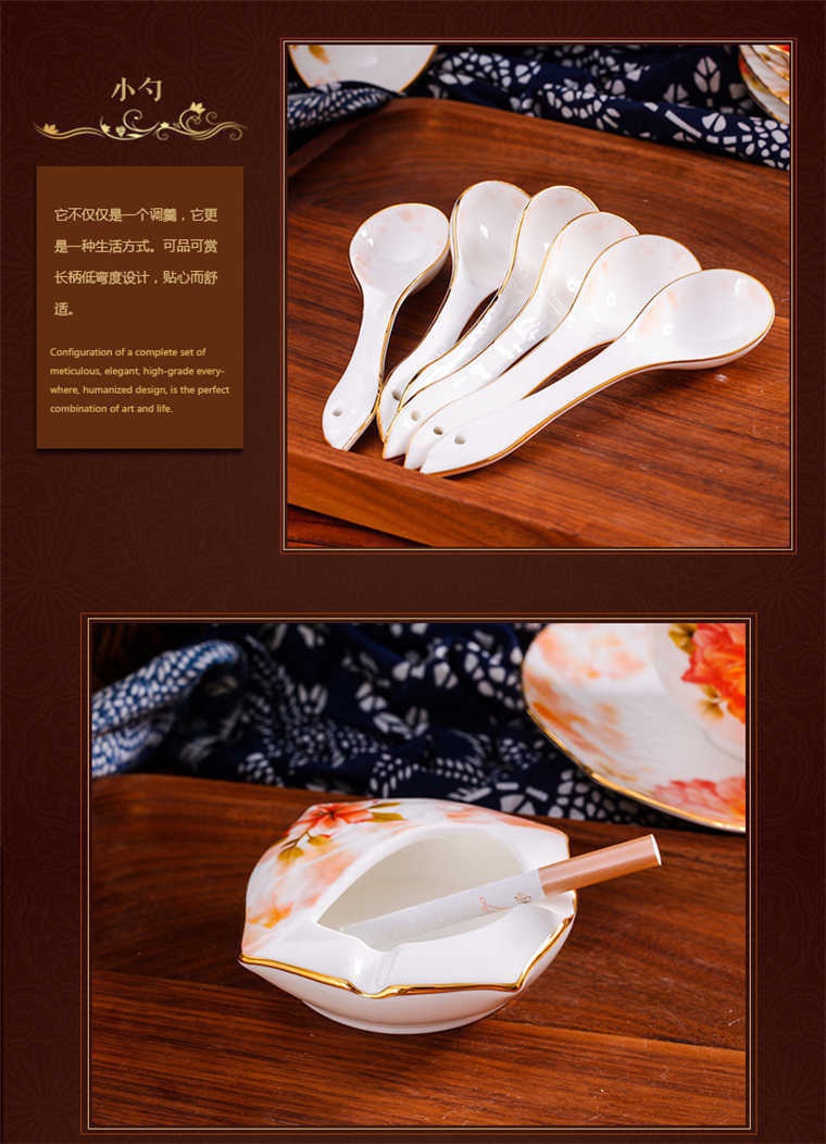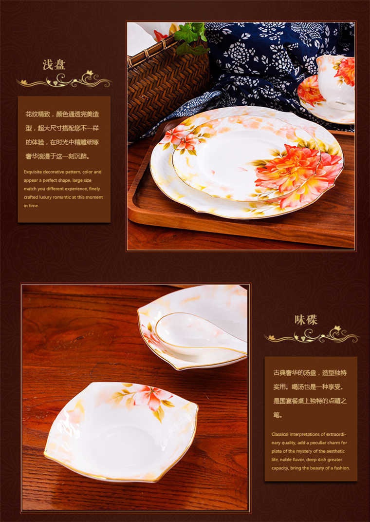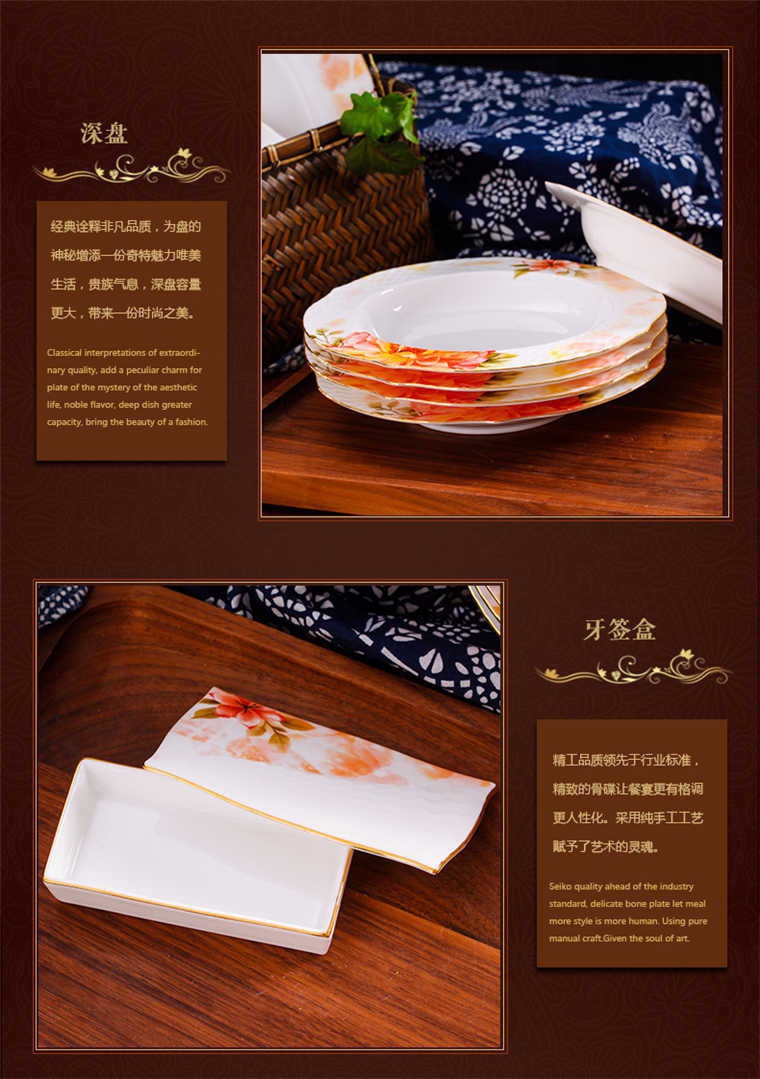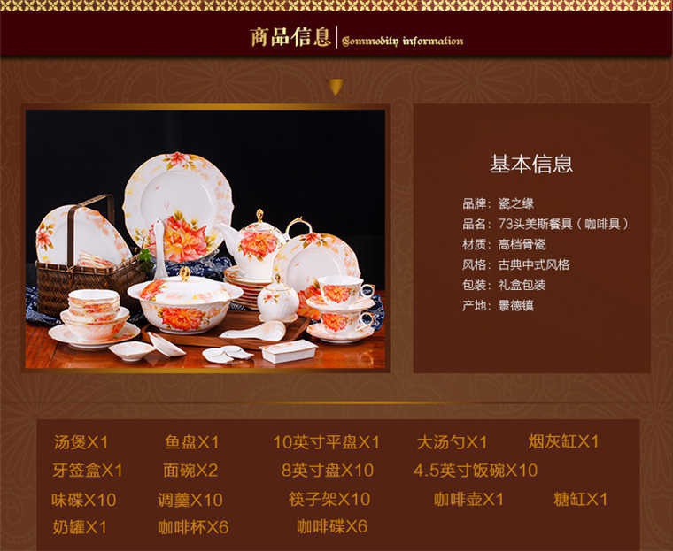 73頭美斯帶咖啡具,餐具一個湯煲,一個魚盤,一個十寸平盤,一個大湯勺,一個煙缸,一個牙簽筒,兩個面碗,十個八寸盤,十個4.5寸飯碗,十個味碟,十個調(diào)羹,十個筷子架。咖啡具一個咖啡壺,一個糖缸,一個奶罐,六個杯子,六個碟子。