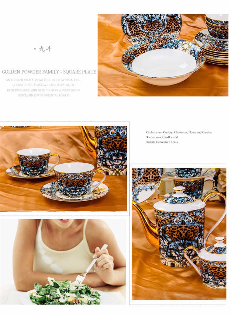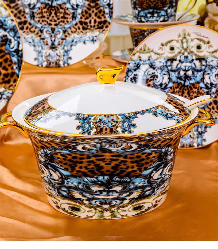 71頭范思哲豹紋餐具,一個(gè)湯煲,一個(gè)大湯碗,一個(gè)大湯勺,一個(gè)煙缸,兩個(gè)胡椒瓶,一個(gè)魚盤,一個(gè)10寸盤,六個(gè)9寸深盤,六個(gè)8寸平盤,六個(gè)8寸月光盤,十個(gè)4.5寸飯碗,十個(gè)小勺,十個(gè)筷子架,一個(gè)咖啡壺,一個(gè)糖缸,一個(gè)奶罐,六個(gè)咖啡杯,六個(gè)碟。